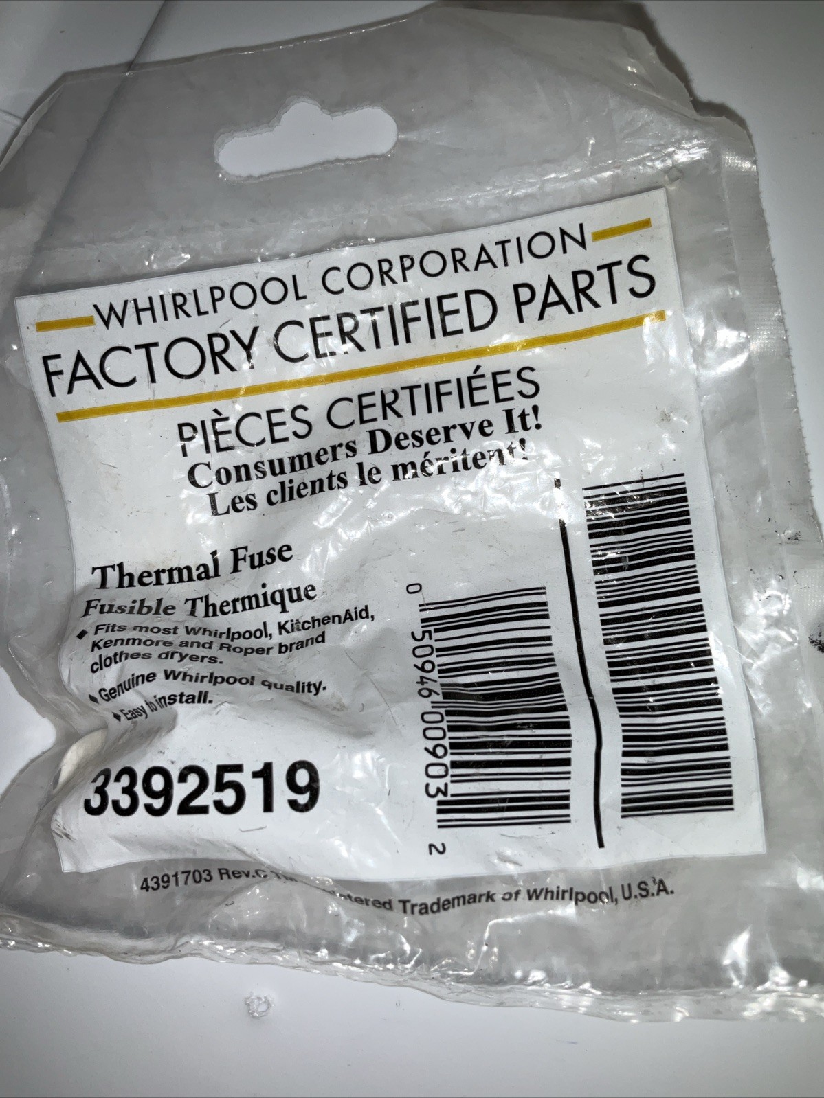 New Genuine OEM 3392519, Dryer Thermal Fuse fits Roper, Kenmore, Whirlpool
